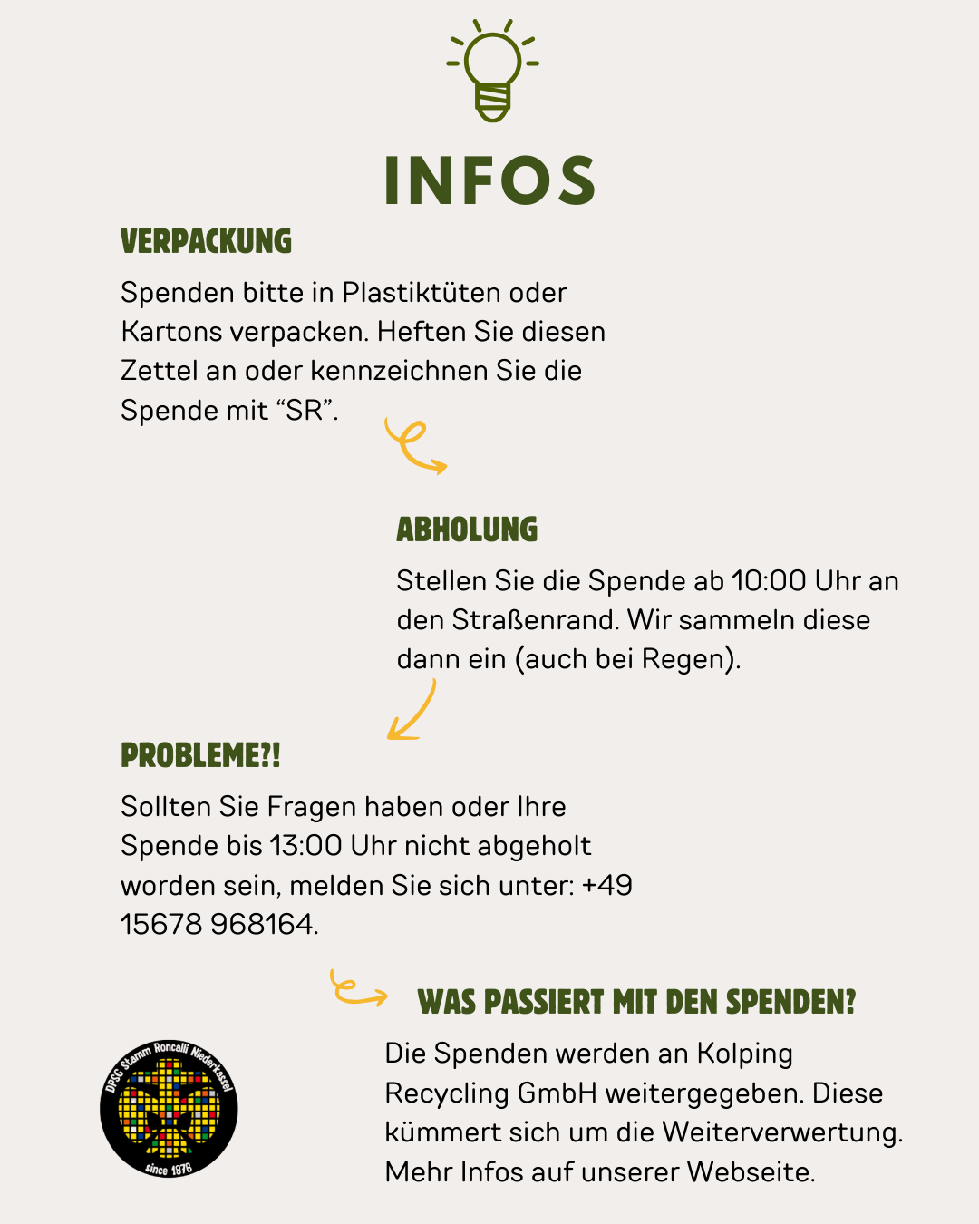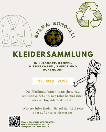 Zudem besteht die Möglichkeit, dass wir Ihre aussortierten Kleidungsstücke bei uns bis zur nächsten Kleidersammlung zwischenlagern. Schreiben Sie uns hierfür eine Mail an keller@stamm-roncalli.de oder rufen Sie uns unter der nachfolgenden Rufnummer an: +49 156 78968164.